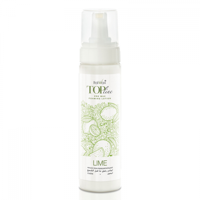 Top Line Lime Előápoló hab egy hidratáló termék, amelyet természetes növényi összetevőkből terveztek, és amely segít felkészíteni a bőrt a szőrtelenítési folyamat előtt. Megtisztítja a bőrt a szennyeződésektől, kozmetikum maradványoktól és faggyútól, ami javítja a wax tapadását a bőrhöz. Habzó tulajdonsága miatt gazdaságos a felhasználása nagy területeken (láb,kar), de ugyanúgy használható érzékeny helyeken (bikinivonal, hónalj). Alkalmazása: